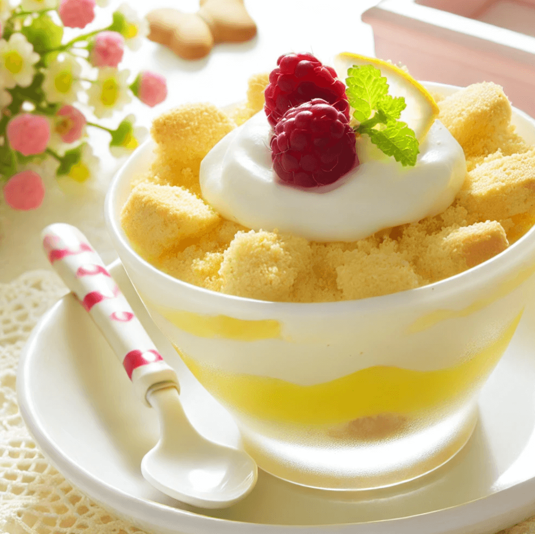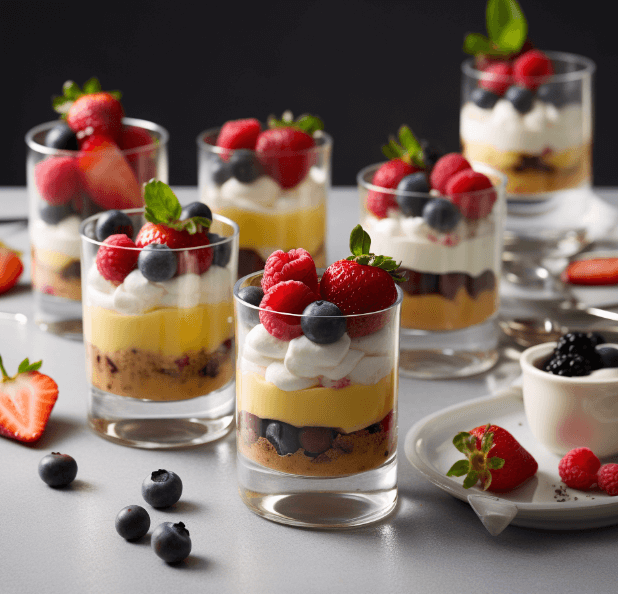Combine layers of sponge cake, custard, fruit, and whipped cream in clear cups. Use fruits like berries, peaches, or mango for added sweetness and color. A sprig of mint on top adds a touch of elegance.