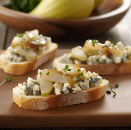 For a bold and unique appetizer, try blue cheese and pear bruschetta. The sharp blue cheese pairs wonderfully with the sweet, juicy pear slices.