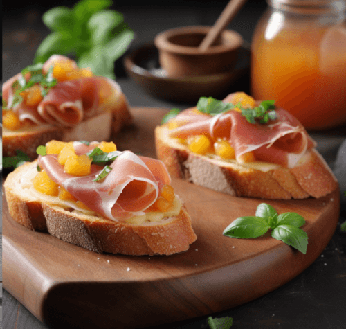 Combine the classic Italian flavors of prosciutto and melon on a toasted baguette. The salty prosciutto pairs perfectly with the sweet, juicy melon for a delightful bite.