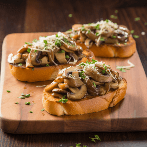 Sautéed mushrooms with garlic and thyme, topped with shaved Parmesan cheese, create a rich and earthy bruschetta that is perfect for mushroom lovers.