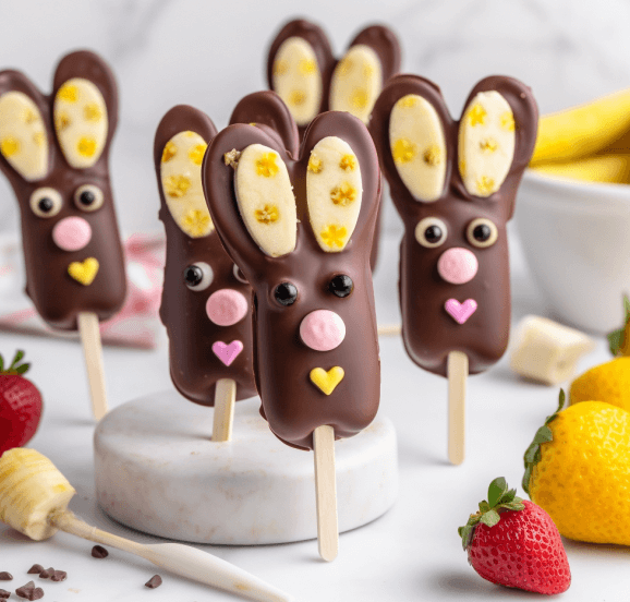Easter Bunny Banana PopsNaturally sweet, dark chocolate coatingKid-friendly, fun Easter snack