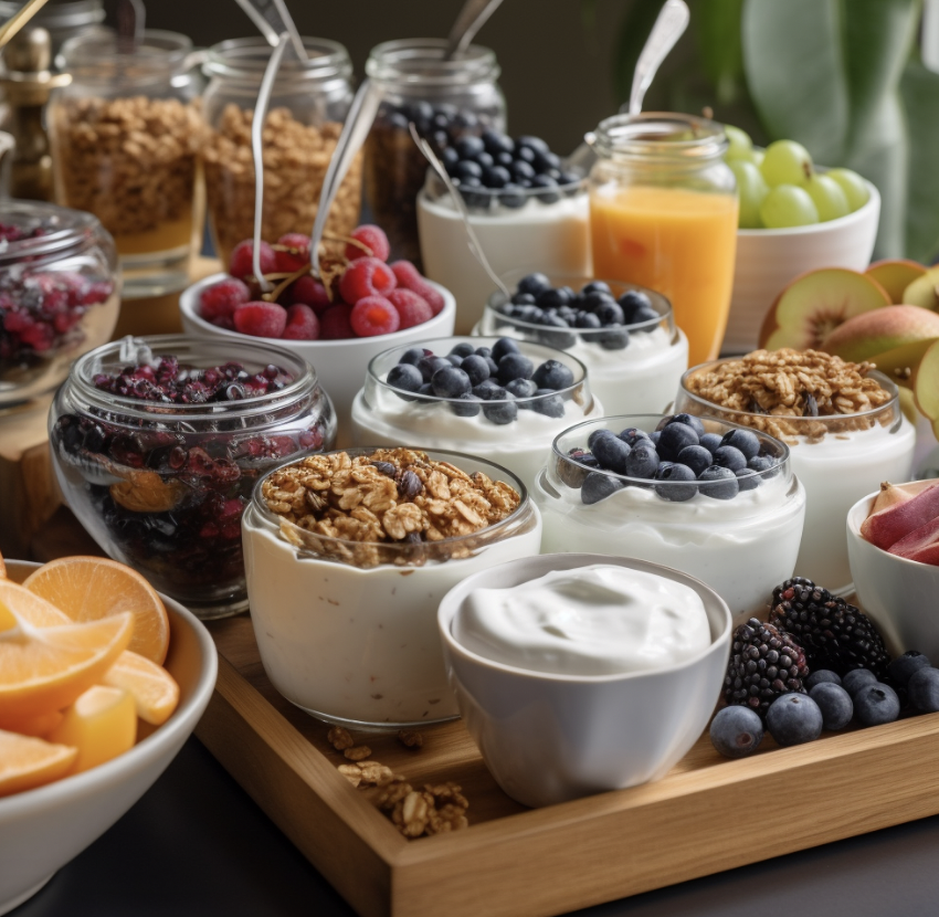Set up a yogurt bar with Greek yogurt, granola, and an array of fruits. It’s healthy, easy, and looks adorable.