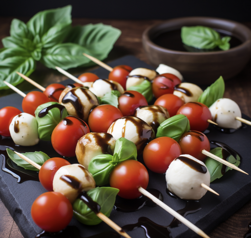 Layer cherry tomatoes, mozzarella balls, and fresh basil on skewers. Drizzle with balsamic glaze.