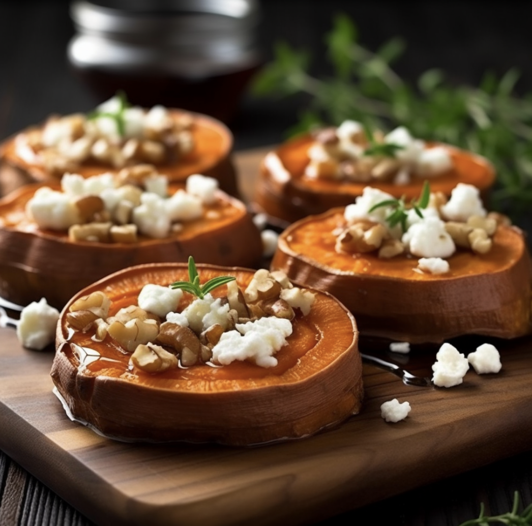 Roast sweet potato slices and top them with goat cheese, honey, and walnuts for a healthy, savory bite.