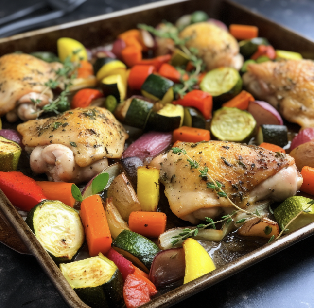 For an easy, healthy option, roast chicken thighs with colorful veggies like bell peppers, carrots, and zucchini. Season with olive oil, garlic, and herbs.