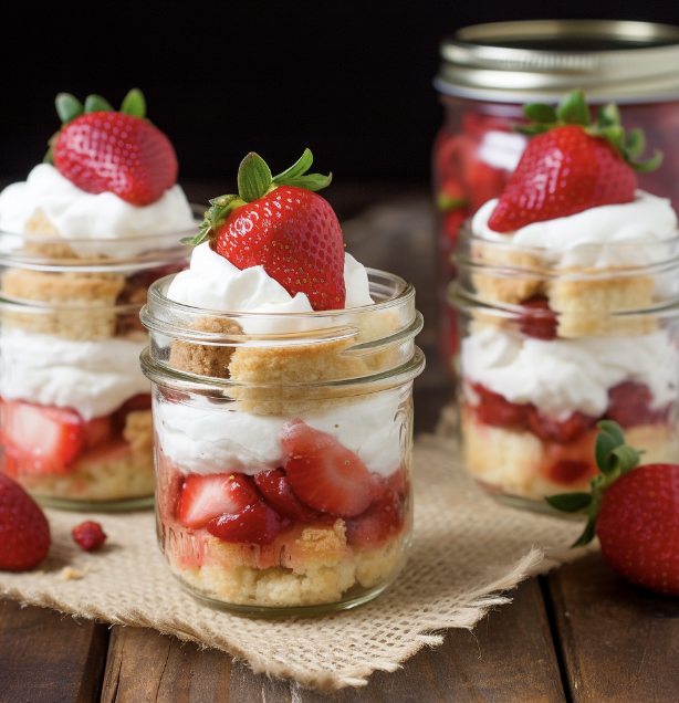 Layer crumbled biscuits, whipped cream, and strawberries in mini cups or mason jars.