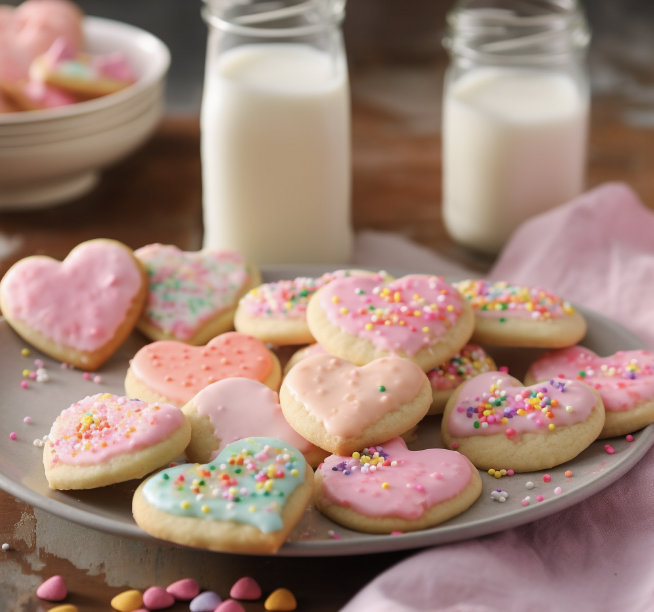 Bake sugar cookies and decorate them with frosting and candy hearts.