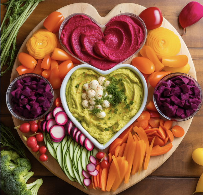 Make it fancy by arranging colorful veggies in heart shapes. Add beet hummus for a Valentine’s Day vibe.