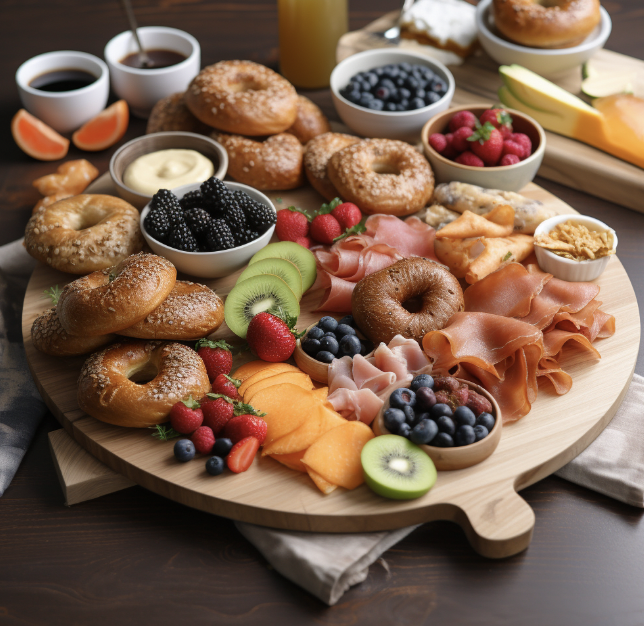 Include mini bagels, smoked salmon, cream cheese, fruit, and pastries for a brunch-themed spread.