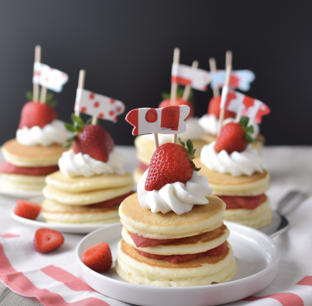 Stack mini pancakes with layers of whipped cream and strawberries. Add a cute toothpick flag to hold it all together.