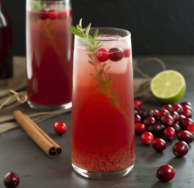 - Ingredients: Cranberry juice, cinnamon, nutmeg, and sparkling water.