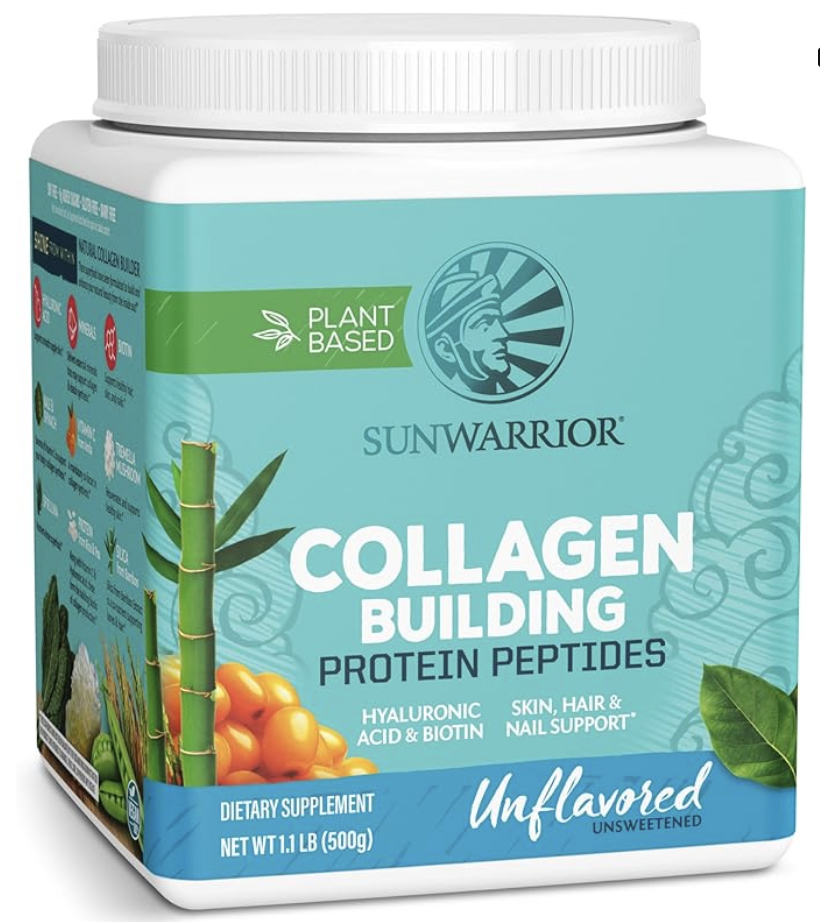 Sunwarrior’s collagen building protein peptides are 100% plant-based, and the ingredients are actually stuff I recognize. Bamboo silica, spirulina, vitamin C from amla, actual foods, not sketchy byproducts.