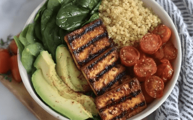 - Quinoa bowl with tofu, spinach, avocado, and tahini dressing.