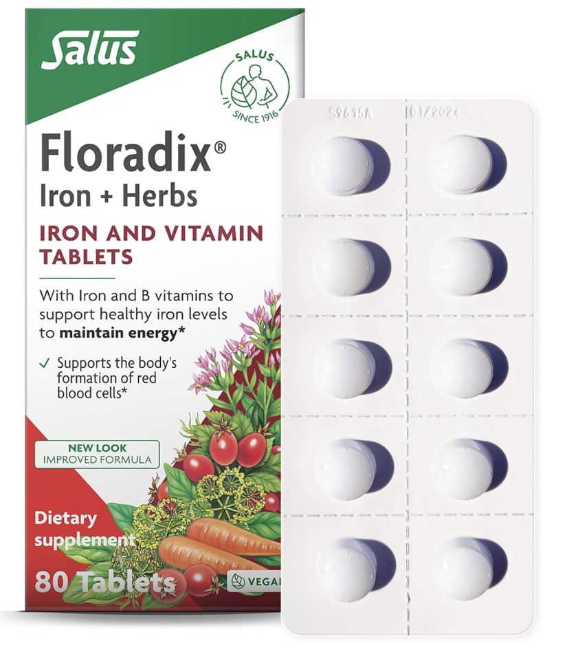 Floradix is an iron supplement made from fruit and herbal extracts. It’s known for being gentle on the stomach (unlike many iron pills that can cause constipation or nausea).