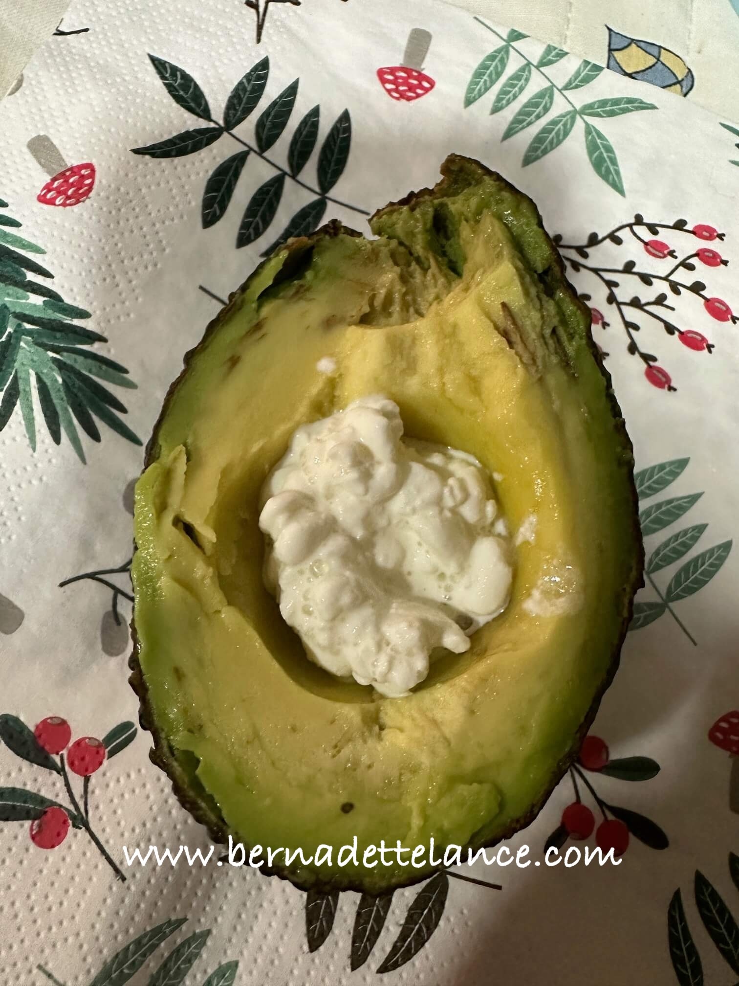 Add cottage cheese in the center like it is a tiny avocado bowl.