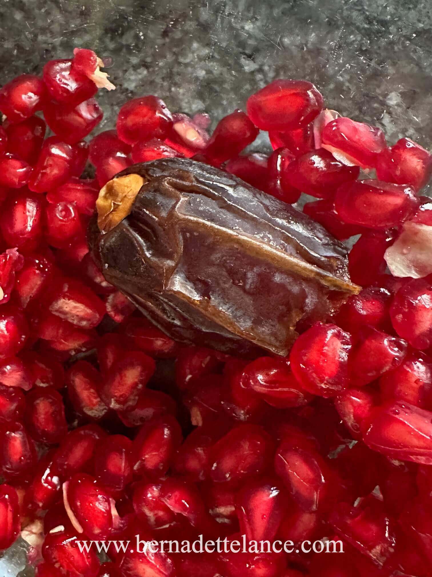 There’s something magical about pairing the chewy caramel sweetness of a date with the sharp crunch of pomegranate seeds. It feels luxurious but simple.