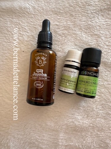I use jojoba oil as the base, then add a few drops of rosemary oil and one or two drops of peppermint oil.