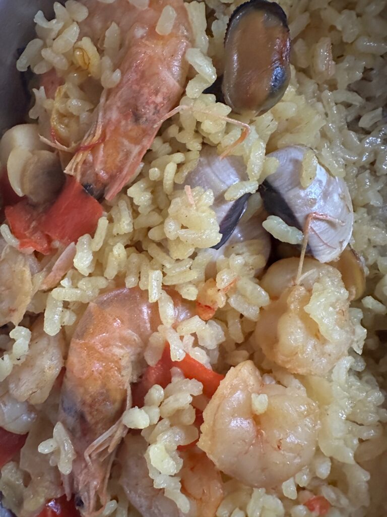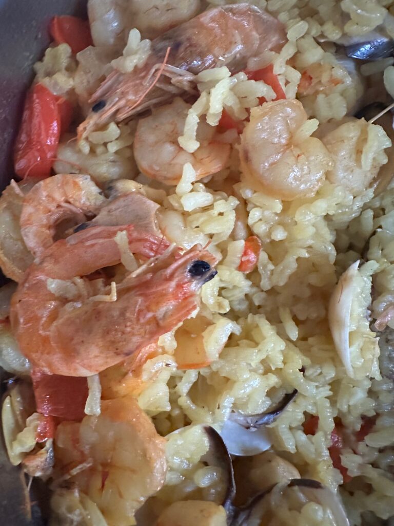 This is a paella de marisco, seafood paella, made the Spanish way.