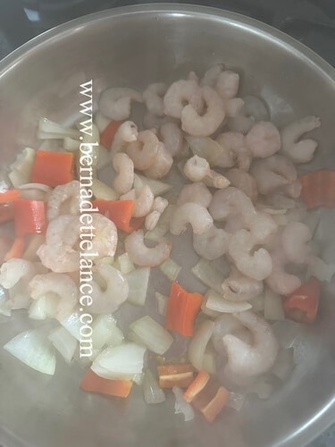 Add the shrimp and seafood briefly.